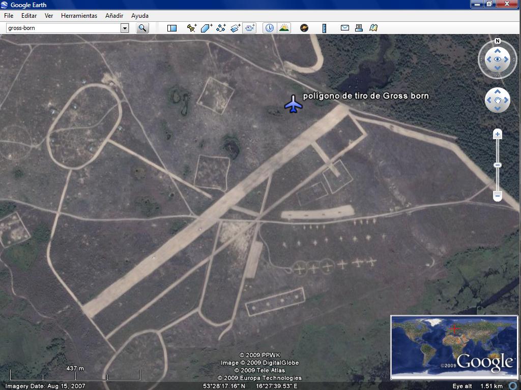 Este es el polígono de tiro de de Gross-Born, en Alemania. Usado durante décadas, es uno de los mayores. En él existen campos de maniobras de carros de combate y, también, una colección de aviones de la extinta RDA, los cuales, y según se puede observar, parecen que sirven como blancos estáticos de suelo, ya que hay varios Mig 21 y otros no indentificados, incluso, destruidos, en el suelo.