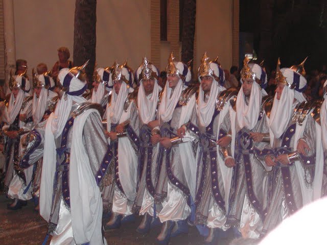 Como contrapunto y obligado complemento las ricas y variopintas vestimentas de moro o de cristiano paseadas con el alegre acompañamiento de las numerosas bandas de música que tiene su máxima expresión y colofón en La Entrada, desfile apoteósico de todos los bandos, donde la vistosidad, alegría y simpatía se desbordan en una larga cabalgata vibrante de música y percusión. (Las fotos las tomé de noche y a bote pronto, espero sirvan.)