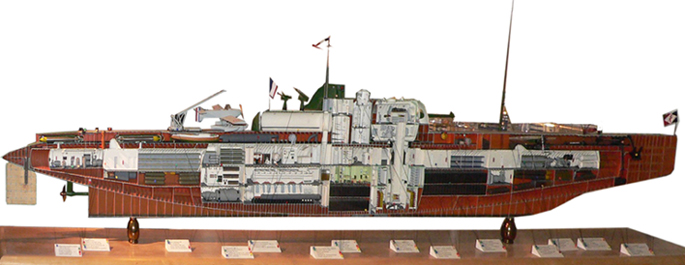 Armas antiaéreas estaban colocadas sobre el hangar, dos cañones de 37mm y cuatro ametralladoras en afustes dobles de 13,2mm. Estamos hablando de un barco de 4.000 toneladas, 110 metros de largo por 9 de manga, con una velocidad de 19 nudos en superficie (2 motores diesel de 7.600hp) y 10 sumergido (2 motores eléctricos de 3400hp), manejado por 120 hombres. Máxima profundidad operativa: 250 pies (casi 80 metros).