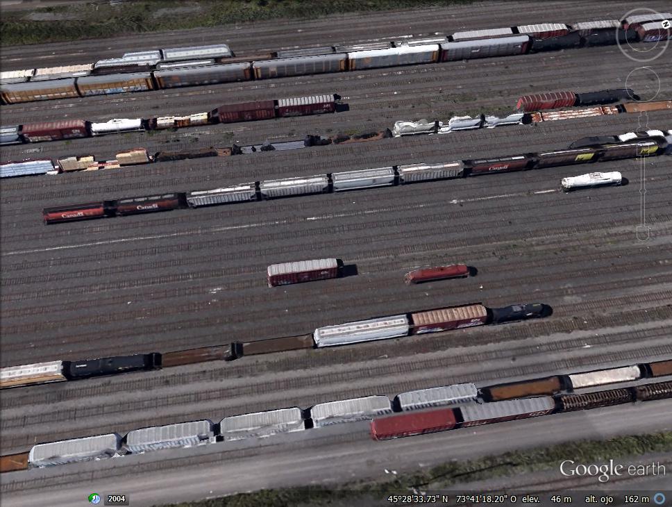 Vi in situ estos convoyes en varios puntos de la Ruta 66 donde coincide carretera y línea ferroviaria y me llamó la atención dos cosas: que pasa un convoy cada rato y que no son trenes normales con una tira de containers, sino tres o 4 locomotoras y los container muchas veces van apilados de dos en dos. Eso no se aprecia con google earth.