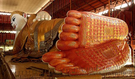 La pagoda Chauk Htat Gyi en Yangon es conocida por su enorme imagen de Buda reclinado de 65 metros de largo. La imagen altamente venerada se encuentra en un gran cobertizo al norte del lago Kandawgyi.