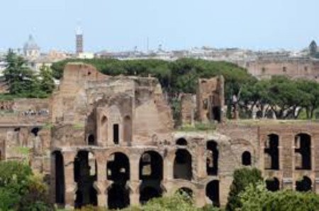 Cuando fuimos al monte Palatino, entramos por la via de San Gregorio y hacia la izquierda nos encontramos, en lo alto del recodo del sendero, con unas ruinas enormes, en varios niveles, con arcadas en varios pisos.