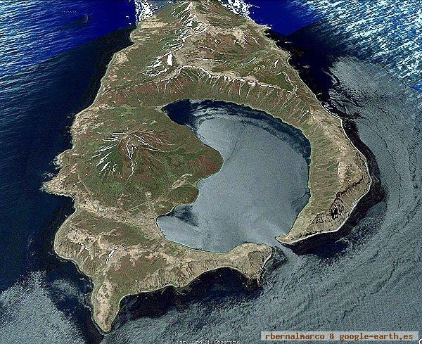 Esta masa continental de 8 kilómetros de longitud alberga cuatro importantes volcanes visibles desde el espacio. Estas imponentes estructuras son, de sureste a noroeste: Milna, Zavaritski, Prevo y Uratman.