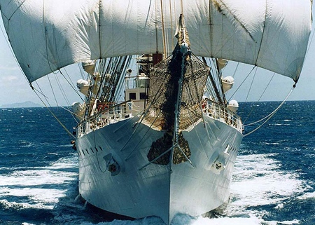 El velamen está compuesto por 27 velas con una superficie de 2650 metros , así distribuidas: 11 velas cuchillas y una cangreja en el palo mesana con botavara metálica. De las velas cuchillas, 5 son foques, 3 estays del palo mayor y 3 estays de mesana. El resto de las velas, es decir 15, son cuadras, distribuidas en 5 palos.