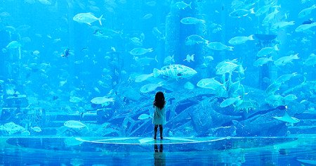 Desde la gigantesca cristalera (es la más grande del mundo y mide 32,8m de ancho y 8,3m de alto) que da a una de las arterias del Dubai Mall, el acuario (10 millones de litros) causa sensación con sus peces exóticos, sus mantarrayas o sus lamias...posee más de 120 especies. Es un espectáculo magnífico sobre todo si se ve desde dentro. En cuanto ha comprado los tiquets (bastante caros, aunque existen varias opciones y tarifas de grupo), entra directamente en un túnel de cristal (48m) que atraviesa todo el acuario y le permite admirar este universo acuático.