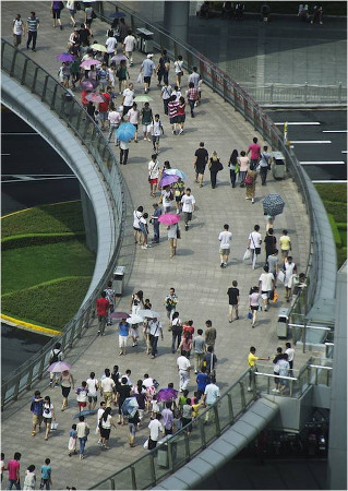 La rotonda peatonal diseñada y construida en el corazón de la zona de Lujiazui, el distrito financiero más importante en China, en la ciudad de Sanghai, resulta una solución eficaz para ambos colectivos.