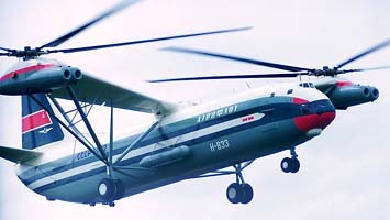El Mil Mi - 12 es el helicóptero de mayor tamaño que ha volado hasta la fecha. El Mi-12 se caracteriza por los dos únicos rotores transversales de régimen que eliminan la necesidad de un rotor de cola. El diseño es similar al del Mil Mi-6 del que el Mi-12 tomó los dos motores y los rotores