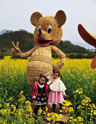 El pasado 26 de marzo mas de 100 espantapájaros de distintas formas y tamaños fueron colocados en este campos de flores amarillas poco antes de que comenzara un festival en el condado. No faltaron turistas que quisieron inmortalizar el momento junto a un Mickey y Donald de paja gigante, pero tampoco faltaron las formas inusuales creadas por artistas folclóricos chinos.
