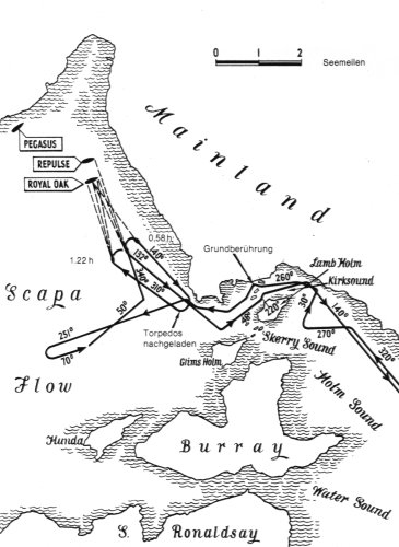 Los intentos de la Primera Guerra Mundial fracasaron, siendo hundidos el U-18 y el U-116. A principios de la Segunda Guerra Mundial, el U-47 comandado por Günther Prien penetró en Scapa Flow el 14 de octubre de 1939 alcanzando al HMS Royal Oak, acorazado de 30200 TM y 192 mt. De eslora, en la bahía de Scapa.