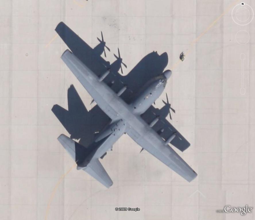 este KMZ que adjunto no tiene aviones, pero es curioso porque se ven perfectamente los agujeros de los misiles en los angares, y si pinchais en la foto de Panoramio, vereis el mismo hangar que se ve en la imagen que adjunto de un B-2 . Realmente no se el motivo de la destrucción de los hangares, pero imagino que debe ser de cuando la primera guerra del golfo, y los iraquies ocupasen la base, bombardeando los americanos seguidamente para su destrucción.