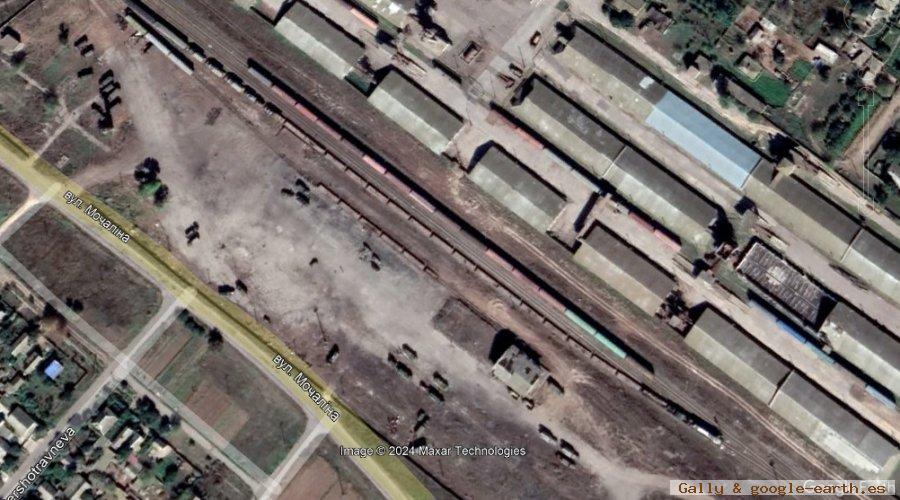 Segundo si acercamos la imagen al pueblo de Myrne, Óblast de Kherson, Ucrania, van a ver una formación de tren completo, pero como es una zona bastante amplia le voy a dividir la zona en 3 partes.