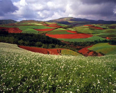 "Tierra Roja se encuentra en el distrito de Dongchuan, al norte de Kunming. Se trata de alrededor de 2600 metros sobre el nivel del mar y un área remota con un mal servicio de transporte público. La extraordinaria suelo pardo rojizo es el resultado de hierro oxidado y varios otros metálicos oxidados minerales. Dongchuan Tierra Roja representa los colores más atractivos del valle de Yunnan montaña. Cultivos en Tierra Roja incluyen papas, avena, maíz, verduras aceite de la flor, etc Debido a que cada familia es propietaria de diversos tamaños y formas de la tierra y plantas de la familia cada uno sus propias preferencias de los cultivos, este cuadro se produce hermosas. Durante la época de cosecha, el suelo es entregado lo que expone este color rojo inusual.