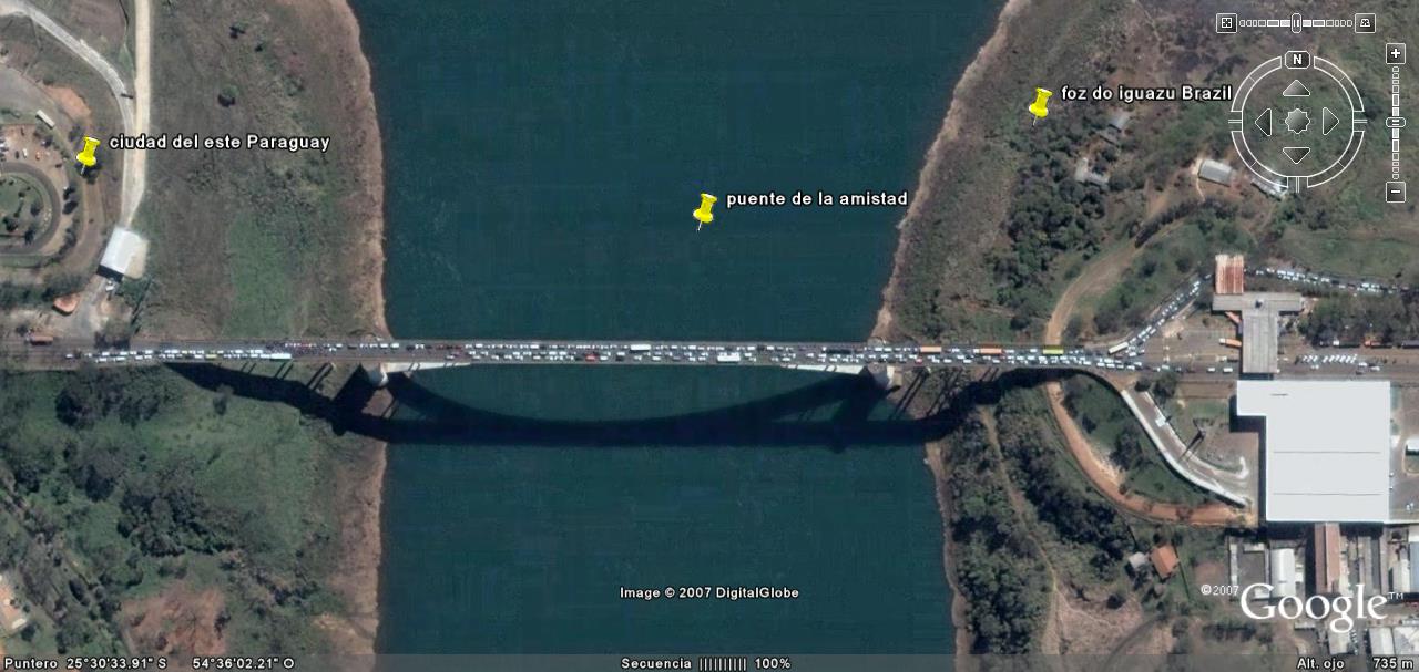 Buenos días Zapatraca. En la foto parece verse un paso por carretera, por el puente entre Brasil y Argentina. Quizá más arriba o más abajo existan similares con Paraguay. Investigalo y termina tu ya que es tuyo ese mensaje.