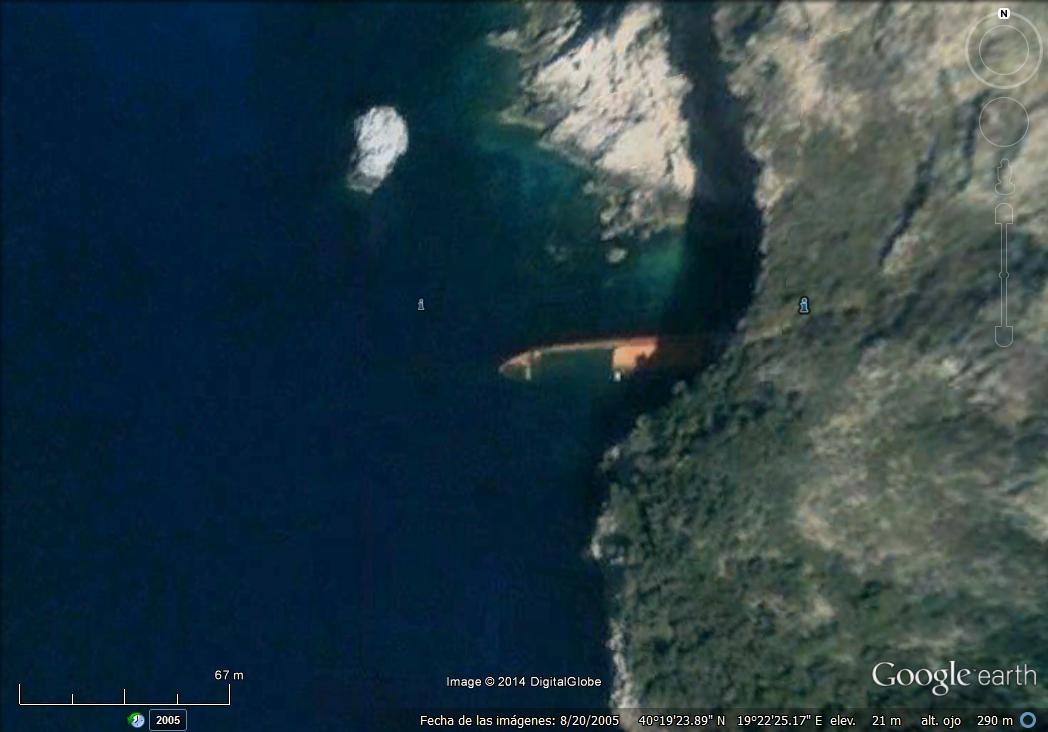 Localización y coordenadas de barcos hundidos, encallados, naufragios en todos los mares, vistos con Google Earth o Google Maps.
