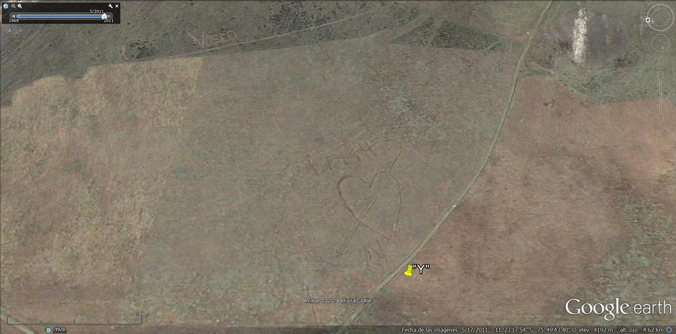 Lugares con dibujos o mensajes sobre techos de edificios o pintados en montañas. Carteles visibles desde el cielo.