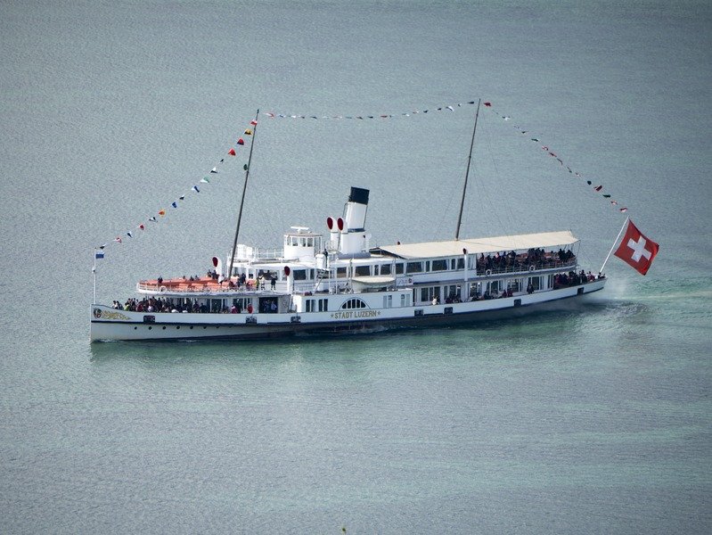 En el lago de Lucerna es el barco de pasajeros más largo, ancho y pesado.