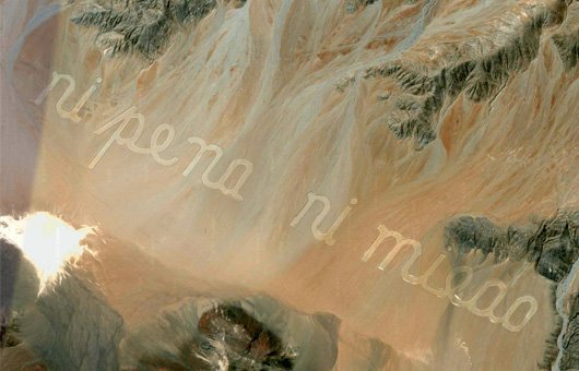 Ni pena ni miedo. Así reza el espectacular geoglifo de tres kilómetros de largo y 400 metros de ancho realizado por el poeta Raúl Zurita, situado en un remoto lugar del desierto de Atacama a 60 km de la ciudad de Antofagasta.