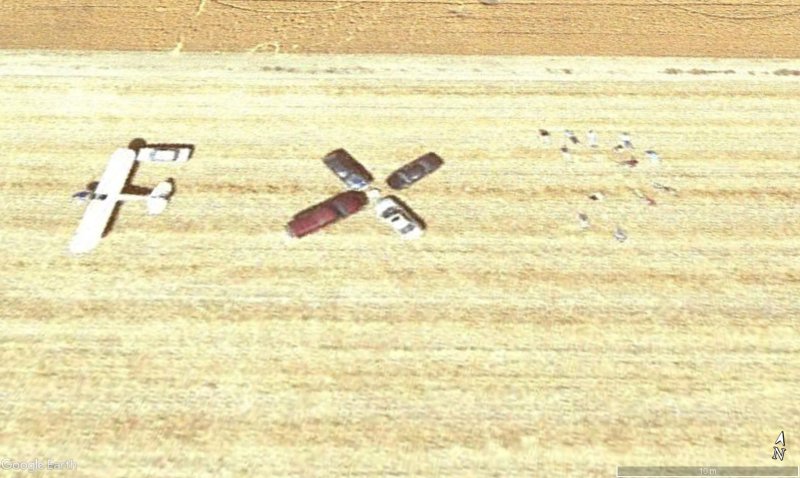 Cierto es, es bastante raro, coches en forma de X, una avioneta acompañada de otro coche al lado, gente reunida en circulos... Un poco turbio todo