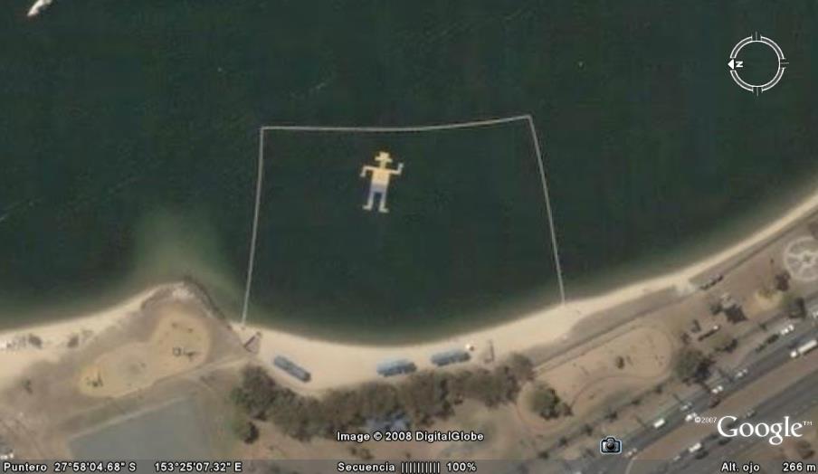 Lugares con dibujos o mensajes sobre techos de edificios o pintados en montañas. Carteles visibles desde el cielo.