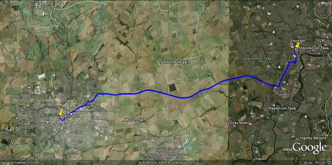 El 23 de mayo de 1822 Comienzan las obras y se inauguró el 27 de septiembre de 1825. Los progresos de este medio de locomoción han sido tan rápidos, y tan habituados nos hallamos a él, que apenas nos es posible comprender el terror que inspiraba a nuestros ancestros las primeras locomotoras. Afirmábase que el establecimiento de las vías férreas haría imposible los pastos; que el aire emponzoñado por los humos de las máquinas mataría las aves; que las casas situadas cerca de la línea serían envueltas por nubes de humo o incendiadas por las chispas que desprendieran aquéllas.