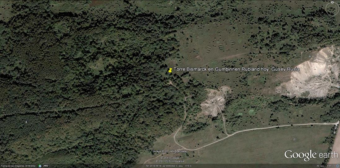 Nota: El lugar exacto de localización de esta Torre (derribada en 1945), si bien encontré su descripción en documentos alemanes, los nombres que orientan al lugar, hoy se encuentran en el idioma de sus nuevos dueños, motivo por el cual solo resultó posible, por el antiguo mapa de esta página (y gracias a la especial forma del lago junto al monte en cuestión). www.ostpreussen.net/ ...richt=1465